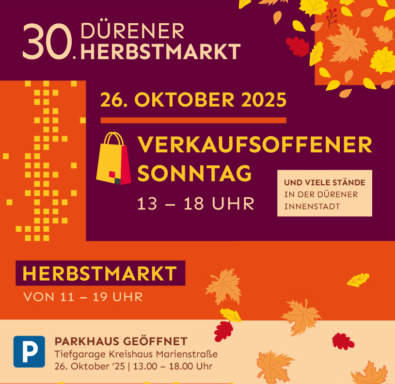 Dürener Herbstmarkt am 26.10.25 mit verkaufsoffenem Sonntag! Kommt vorbei und genießt eine bunte Herbststimmung in der ganzen Innenstadt. Die Geschäfte öffnen von 13:00 bis 18:00 Uhr nutzt die Zeit zum entspannten Stöbern, Schnäppchenjagen und ...
