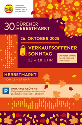 Dürener Herbstmarkt am 26.10.25 mit verkaufsoffenem Sonntag! Kommt vorbei und genießt eine bunte Herbststimmung in der ganzen Innenstadt. Die Geschäfte öffnen von 13:00 bis 18:00 Uhr nutzt die Zeit zum entspannten Stöbern, Schnäppchenjagen und ...