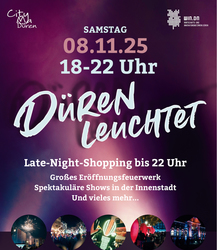 Düren leuchtet 2025 Lange Einkaufsnacht steht vor der Tür! Die Vorbereitungen laufen auf Hochtouren, denn viele Gebäude vom Rathaus über die Musikschule bis hin zu unseren Museen verwandeln sich mit einer spektakulären Lichtinszenierung in eine ...