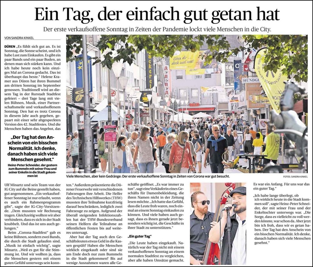 Viele Menschen, aber kein Gedränge: Der erste verkaufsoffene Sonntag in Zeiten von Corona war gut besucht. Auch wenn auf ein Stadtfest verzichtet werden musste, hatte dieser Tag den Anschein von etwas Normalität, wonach sich viele Menschen gesehnt hatten. Viele Geschäfte wurden aufgesucht, es wurde sichtlich entspannt gebummelt und der Besuch der Gastronomien bei strahlendem Sonnenschein genossen.